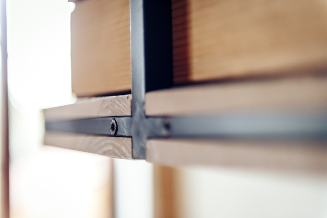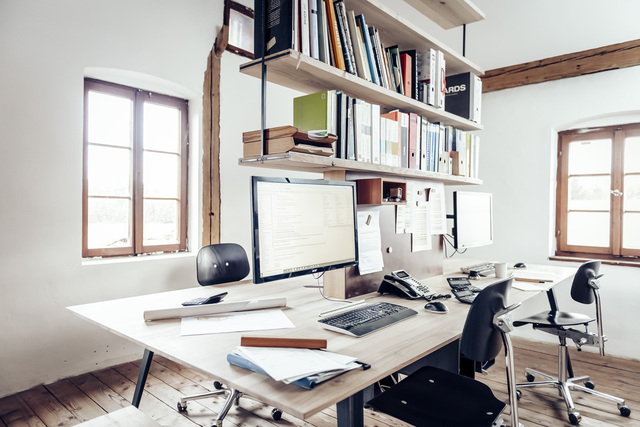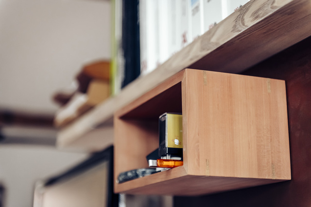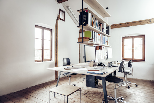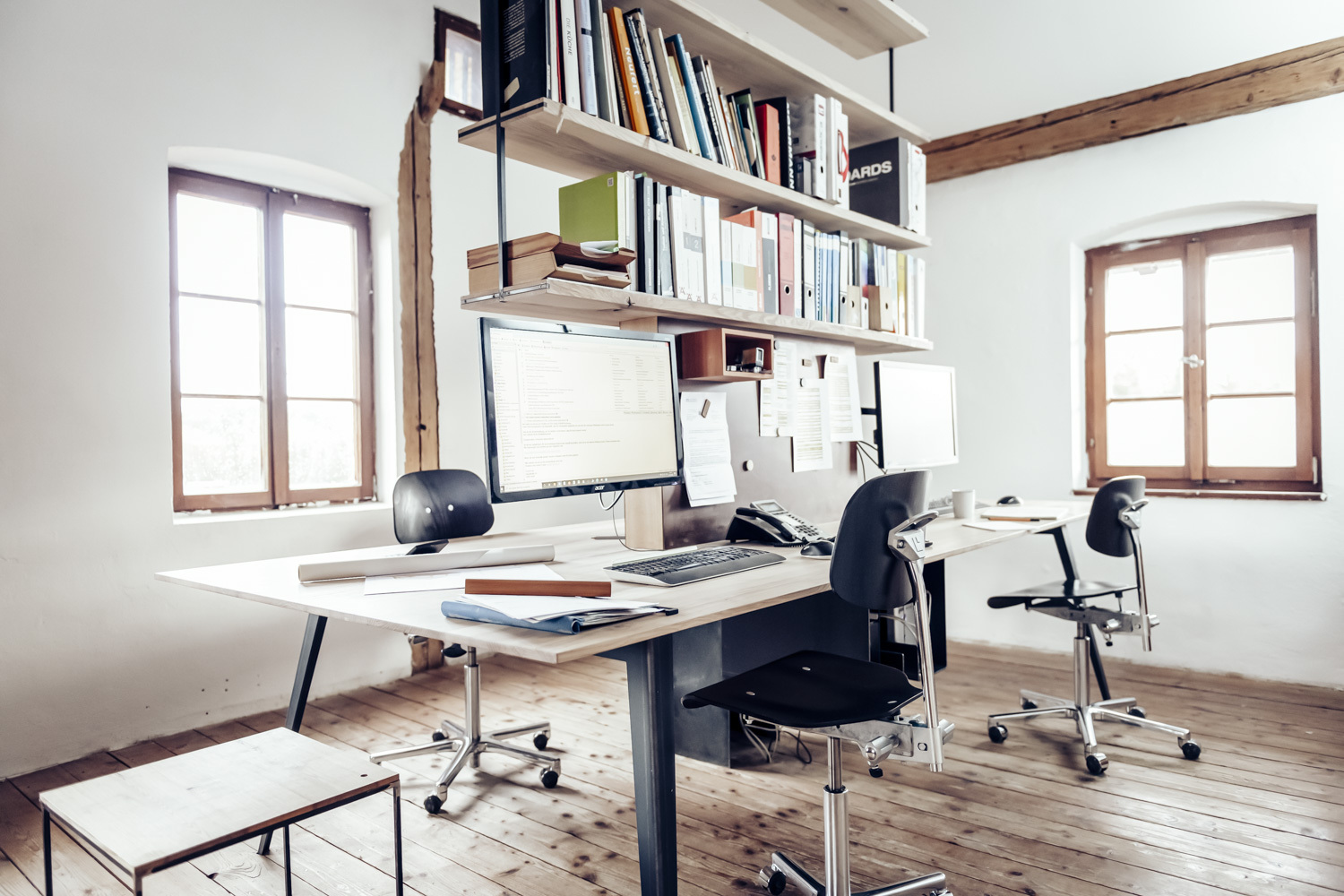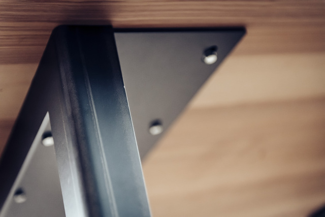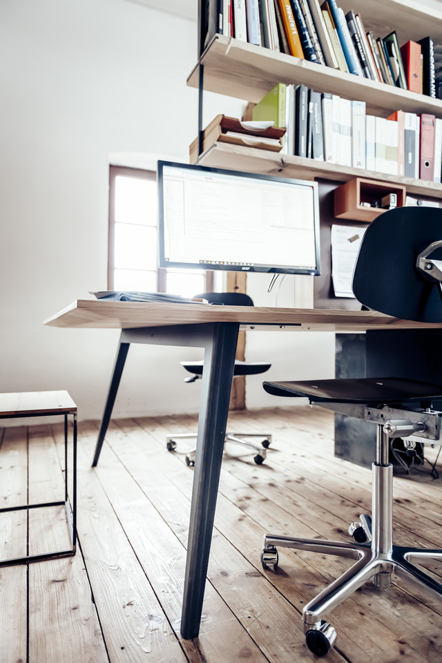 elf° ist immer aus einem Stück Holz und zwei aus Stahl gefalteten Beinen gearbeitet. Er ist zerlegbar und hält ein Leben lang. Möglicherweise auch drei. Hier in der Funktion als Gruppenarbeitsplatz für vier.