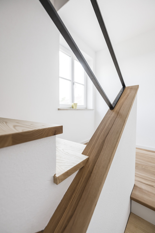 Puristischer Handlauf statt eines klassischen Geländers. Dazu braucht’s ein Widerlager. Gemauert und mit Holzauflage so grundsolide wie puristisch. Vor allem aber passend zur Gesamtarchitektur und zum Raumgefühl, das der Bauherr haben wollte.