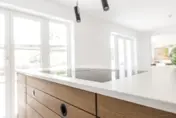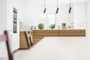 Geradlinig und puristisch – auch im Wortsinn: mattweiße Oberflächen und Fronten, prägnantes Design in den unterteilenden Eichenelementen. Letztere aus einer einzigen großen Platte geschnitten für harmonische Natürlichkeit. Und ja, Schubladen und Schränke sind vorhanden. Wo, das weiß unser Kunde. Und wir.