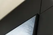 Eine reduzierte graue Rückwand als reiner Arbeitsbereich. Dafür ein umso präsenterer Küchenblock im Zentrum. Mit Nussbaum-Rippenstruktur so schlicht wie lebendig. Mit Granitarbeitsplatte so robust wie langlebig. Mit Lichtstäben von oben so dezent wie einladend. Praktisch zum Kochen, einladend zum Ratschen und dank der runden Ausführung gefahrlos für vorbei huschende Kinderköpfe – und sich länger mal anlehnende Erwachsenenhüften.